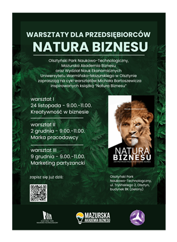 „Natura Biznesu” to cykl trzech bezpłatnych spotkań, na które zaprasza Olsztyński Park Naukowo-Technologiczny, Mazurska Akademia Biznesu oraz Wydział Nauk Ekonomicznych Uniwersytetu Warmińsko-Mazurskiego w Olsztynie. Podczas praktycznych warsztatów uczestnicy poznają techniki i narzędzia, dzięki którym będą mogli rozwijać kreatywność oraz budować silną markę pracodawcy. Dowiedzą się także, jak skutecznie promować swoją firmę.