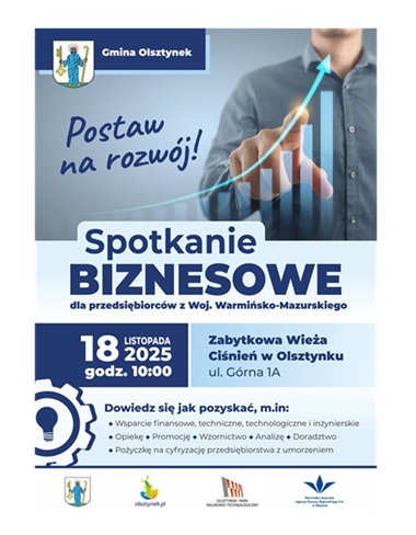 Gmina Olsztynek zaprasza przedsiębiorców z Warmii i Mazur na spotkanie biznesowe, które odbędzie się 18 listopada 2025 roku w Olsztynku.