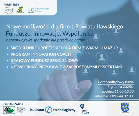 Spotkanie networkingowe dla przedsiębiorców z powiatu iławskiego obejmie omówienie kluczowych możliwości wsparcia dla firm – od niskooprocentowanych pożyczek unijnych dla przedsiębiorstw oferowanych w ramach Funduszy Europejskich dla Warmii i Mazur, po finansowanie szkoleń dla pracowników i pracodawców z Krajowego Funduszu Szkoleniowego.