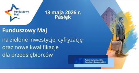 Lokalny Punkt Informacyjny Funduszy Europejskich w Elblągu zaprasza przedsiębiorców na bezpłatne spotkanie informacyjne pt. „Funduszowy Maj na zielone inwestycje, cyfryzację oraz nowe kwalifikacje dla przedsiębiorców”, które odbędzie się 13 maja 2026 roku w godzinach 10:00–12:45 w siedzibie Stowarzyszenia Centrum Rozwoju Ekonomicznego Pasłęka (Pl. Św. Wojciecha 3 w Pasłęku).